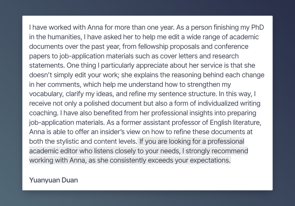 As an editor, I bring a rigorous eye for detail, fluency in academic writing and research conventions, a strong sense of structure, and a knack for helping writers clarify complex ideas. I also bring deep insider knowledge about graduate school, academic publishing, academic job searches, funding and hiring committees, and promotion and tenure processes.